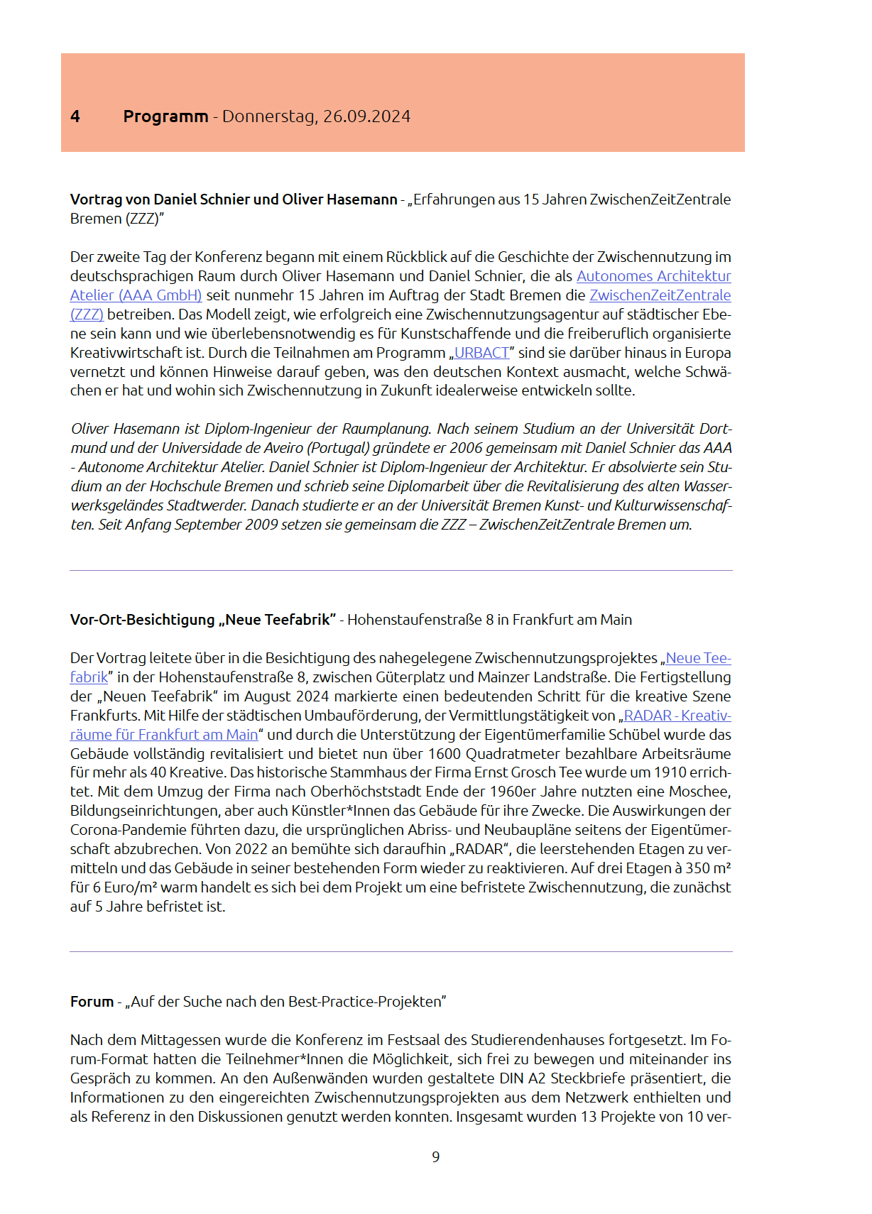 Am zweiten Tag liegt der Fokus auf praktischen Erfahrungen. Zunächst gibt es einen Bericht über 15 Jahre ZwischenZeitZentrale Bremen (ZZZ), gefolgt von einer Besichtigung der „Neuen Teefabrik“. Am Nachmittag wird in einem Forum über bundesweite Zwischennutzungsprojekte diskutiert. Den Abschluss bildet eine Podiumsdiskussion mit Vertreter*innen verschiedener Initiativen.