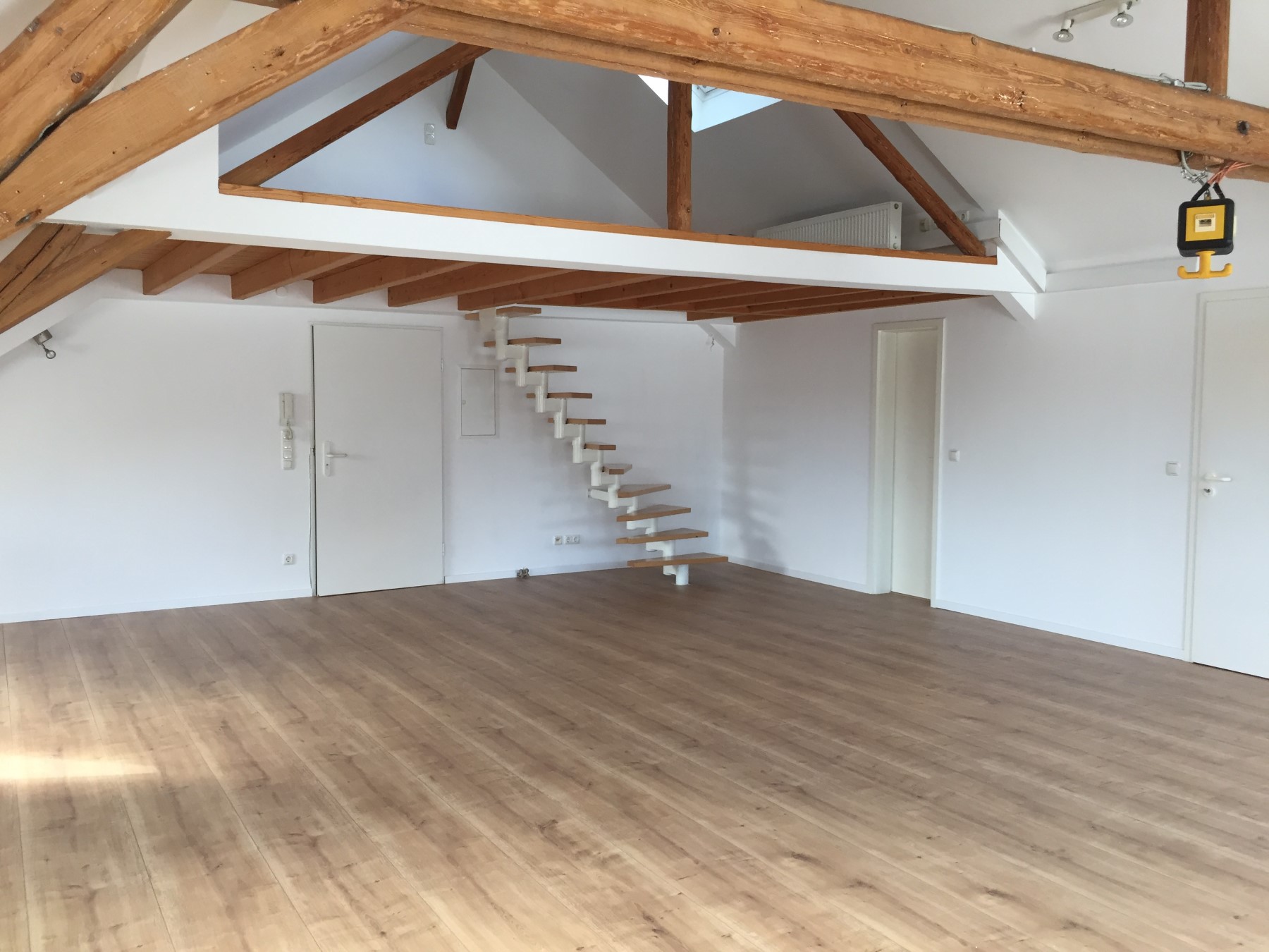 Ab sofort ist in Frankfurt-Hausen eine ca. 87qm große Atelier- und Bürofläche im 2.OG frei, die 2019 renoviert wurde. Die schöne Giebelkonstruktion wurde erhalten und eine Zwischenebene direkt unter dem Dach eignet sich hervorragend als Lagerfläche oder auch Besprechungsraum.