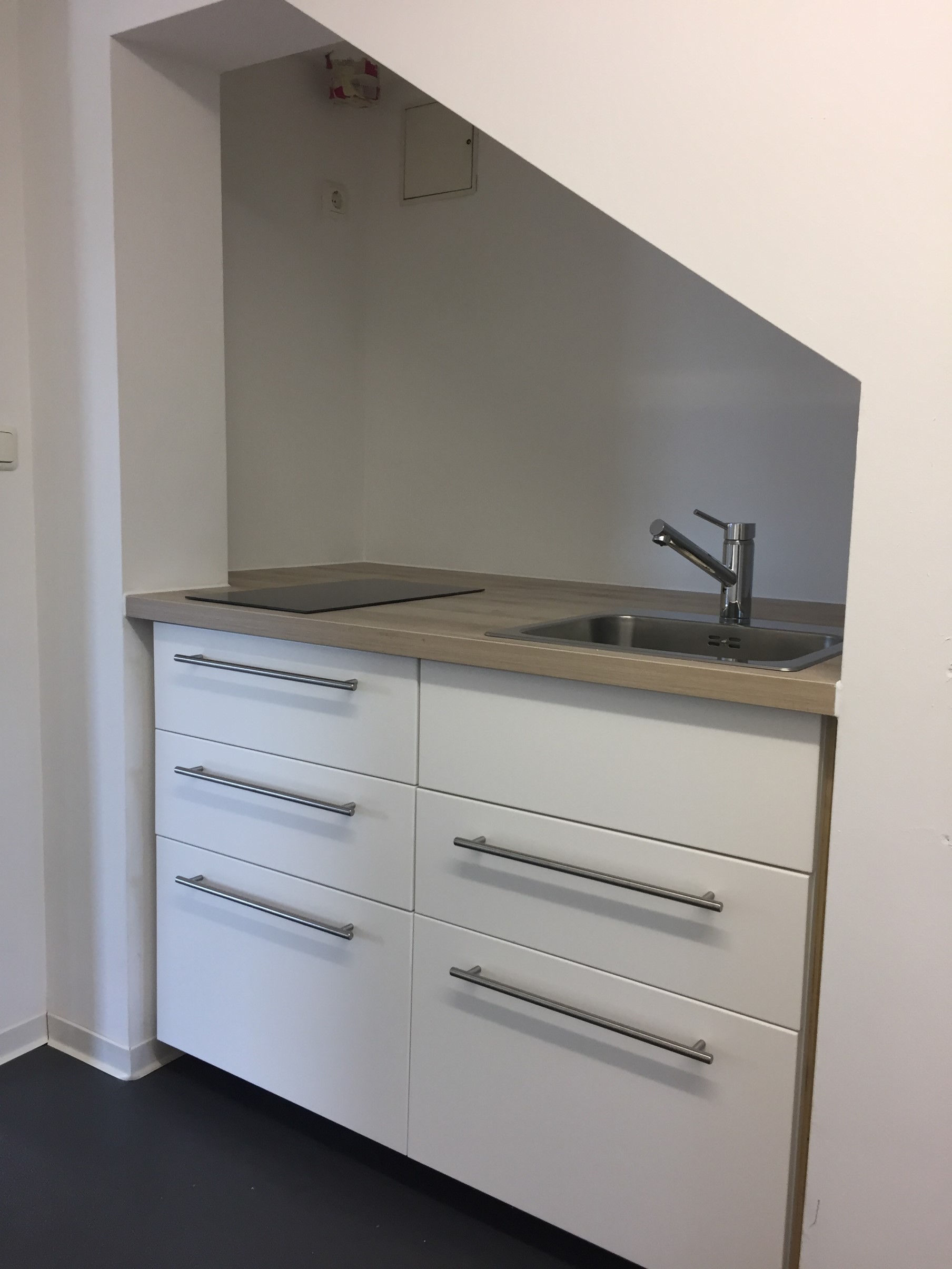 Vorhanden ist ein modernes Bad mit integrierter Dusche sowie eine Teeküche mit Waschbecken und Schränken. Die Raumaufteilung ist variabel gestaltbar, das Einziehen von Wänden in Trockenbauweise ist möglich.
