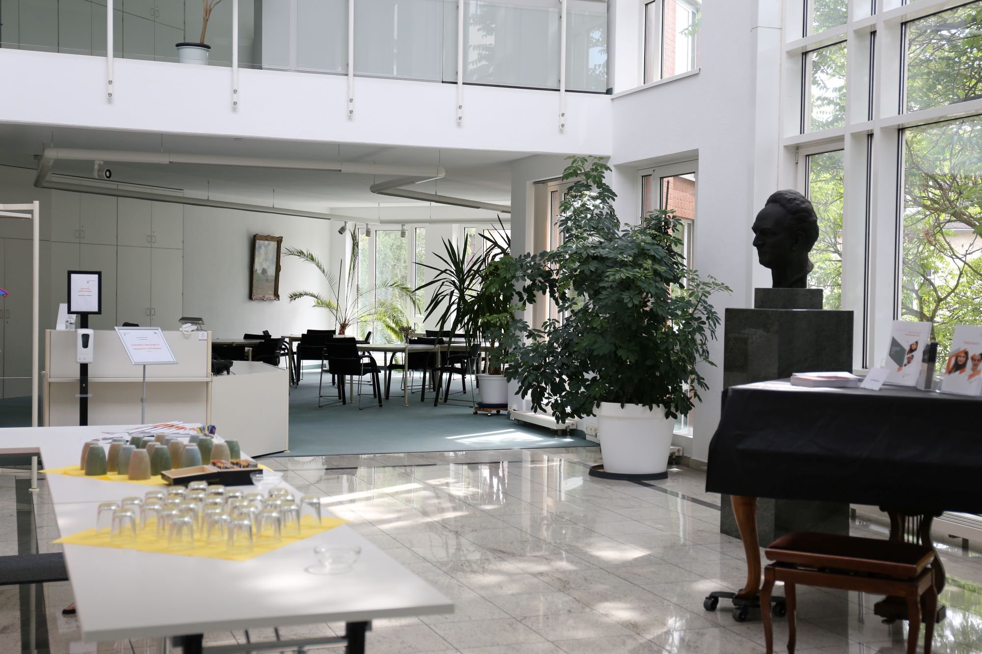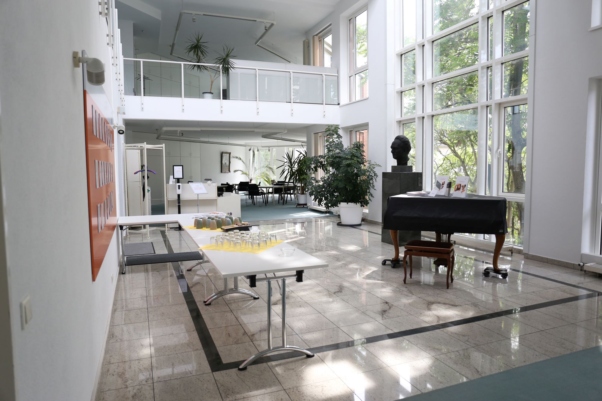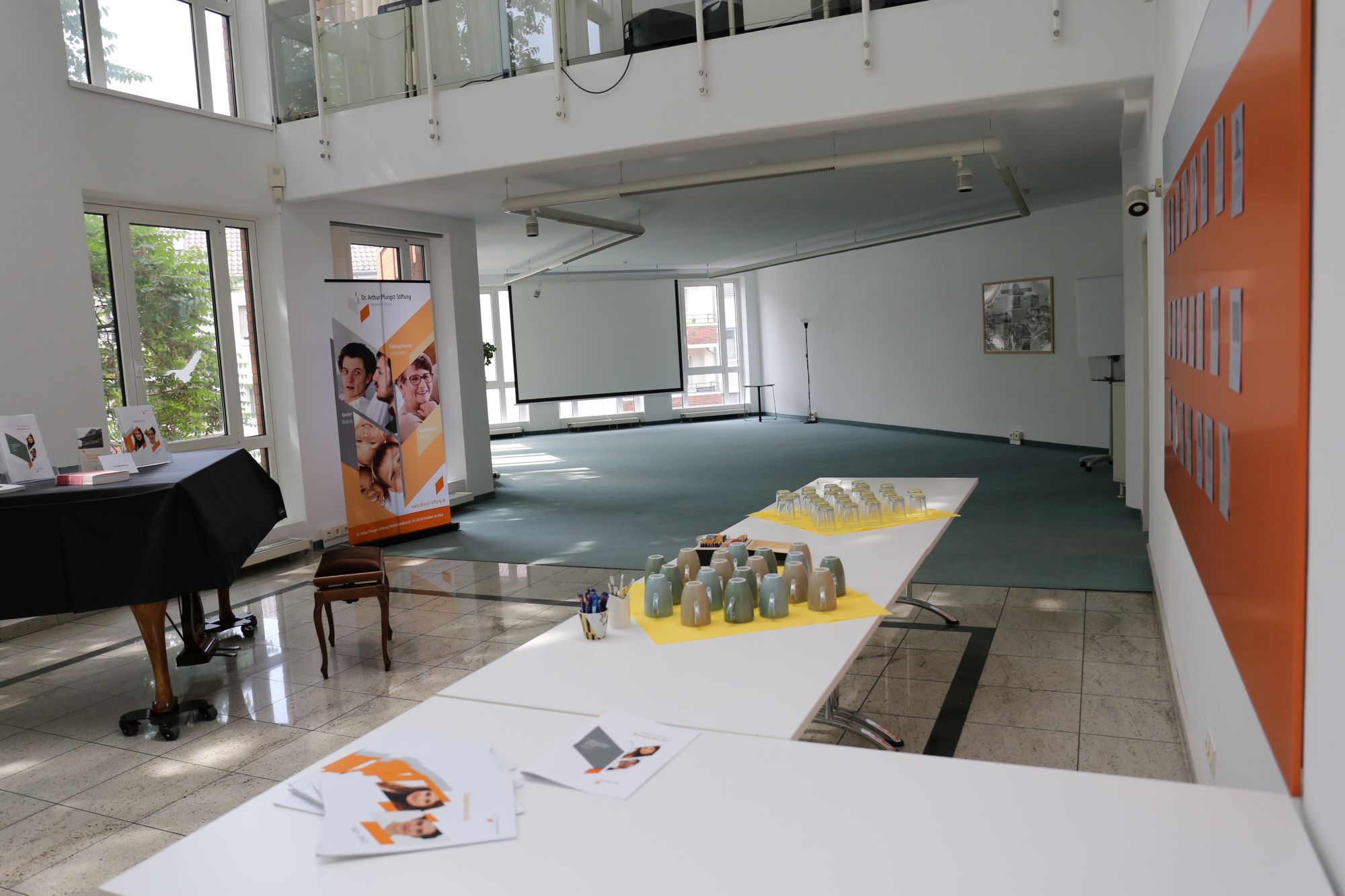 Daneben den Tagungsbereich, in dem 24+ Stühle mit bis zu 8 Tischen aufgestellt werden können. Flipchart, Beamer und Leinwand sind vorhanden. Für Sport-/Musikveranstaltungen wird dieser Bereich (ca. 100 m², Teppich) freigeräumt. Auf der anderen Seite des Raumes stehen fünf runde Tische mit Stühlen, die für Gespräche oder ein Essen genutzt werden können. Zentral steht ein Flügel, der für Musikveranstaltungen genutzt werden kann.