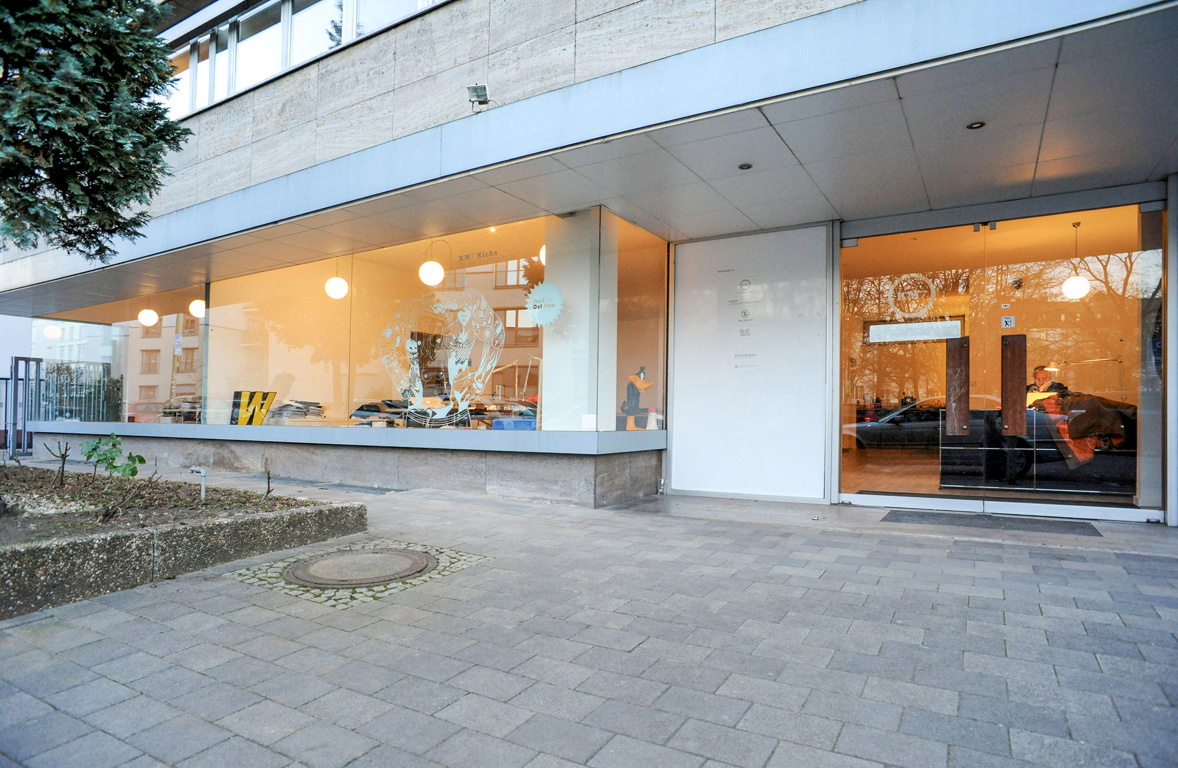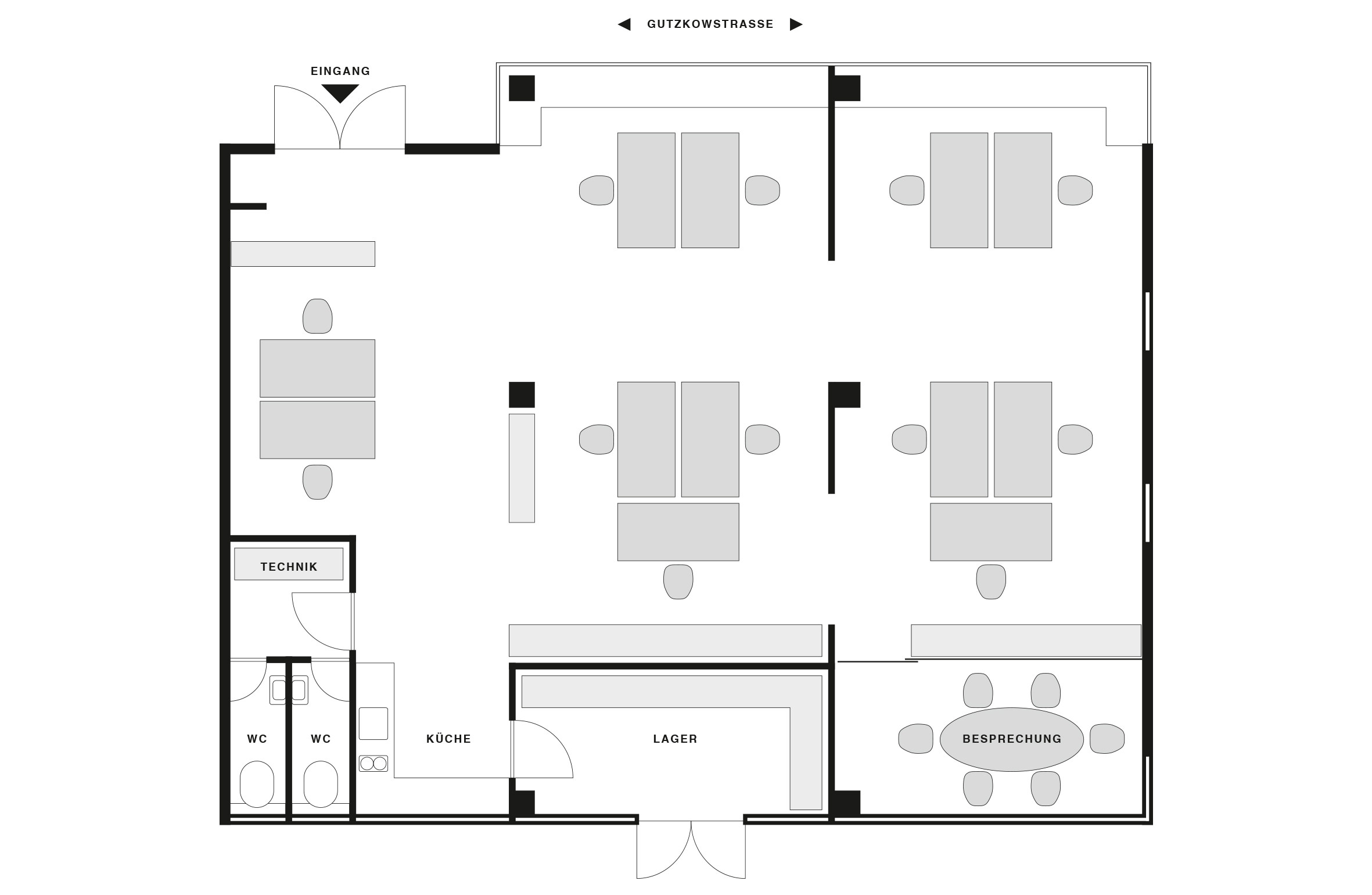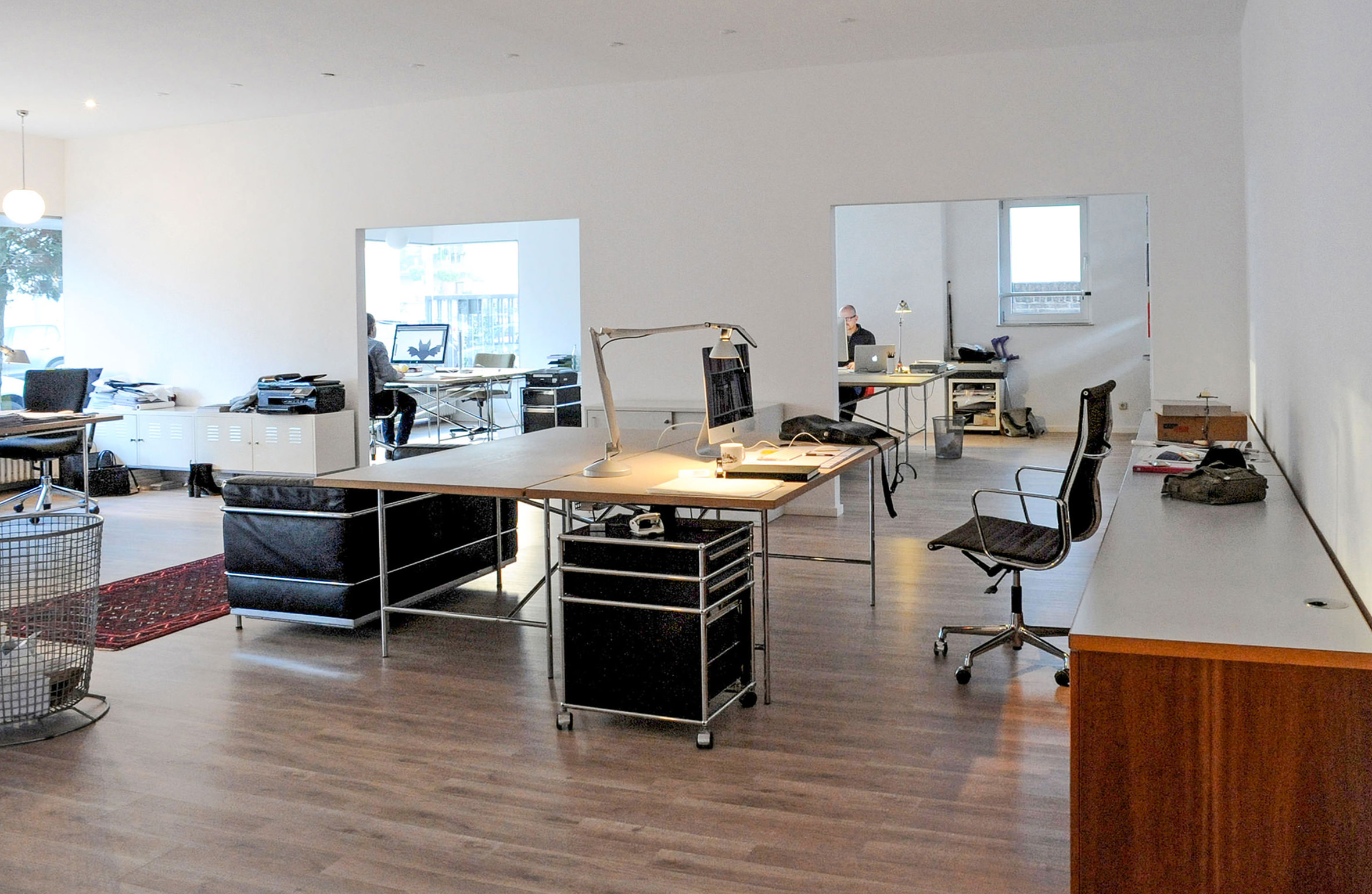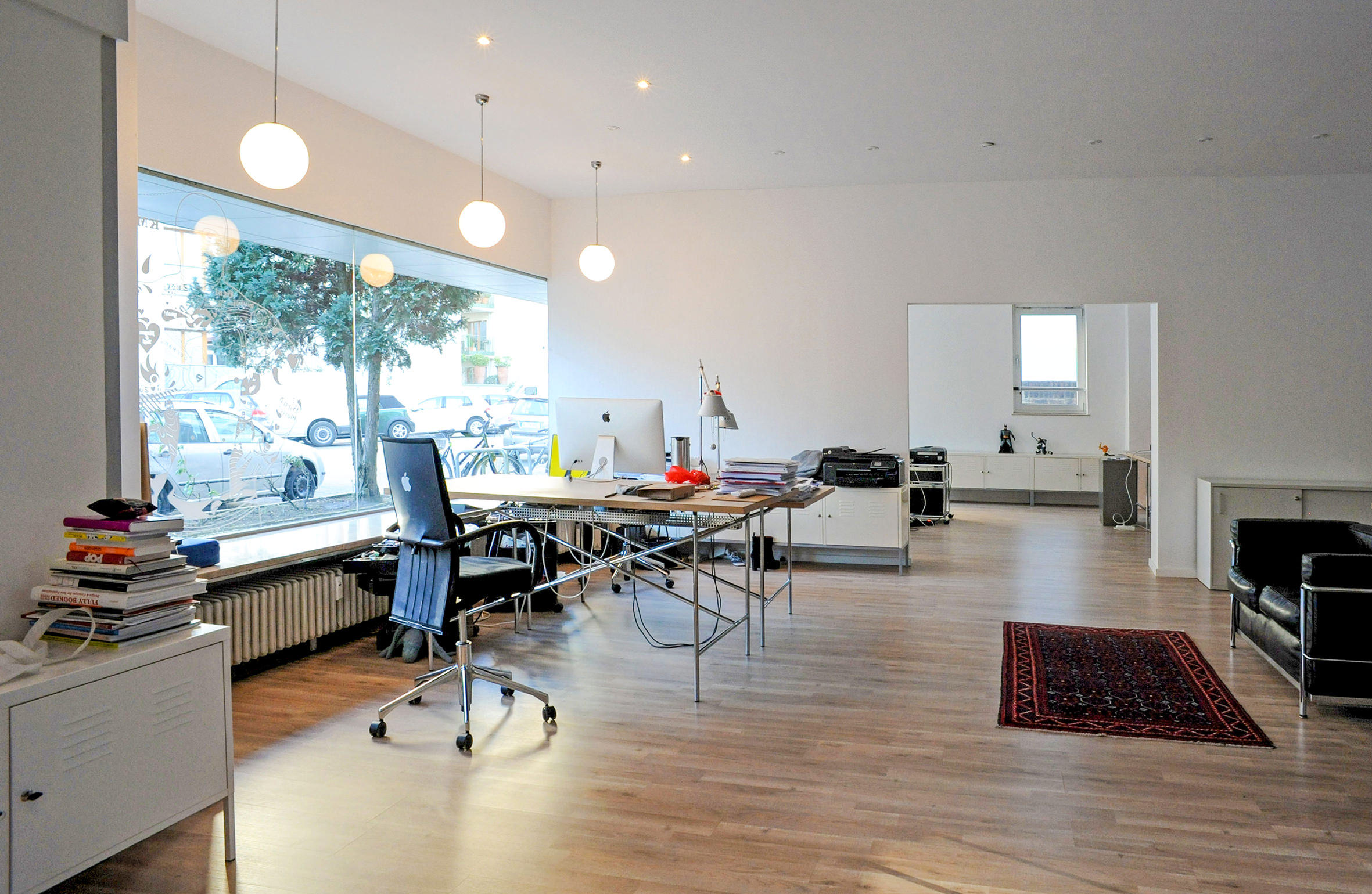 Das loftartige Büro (180 qm) im Erdgeschoss mit großen Fensterflächen und eigenem Eingang ist mit Eiermann-Schreibtische möbliert und besitzt einen Besprechungsraum, eine offene Küche, Keller, zwei getrennte Toiletten, Abstellraum, W-Lan und sw-Drucker.