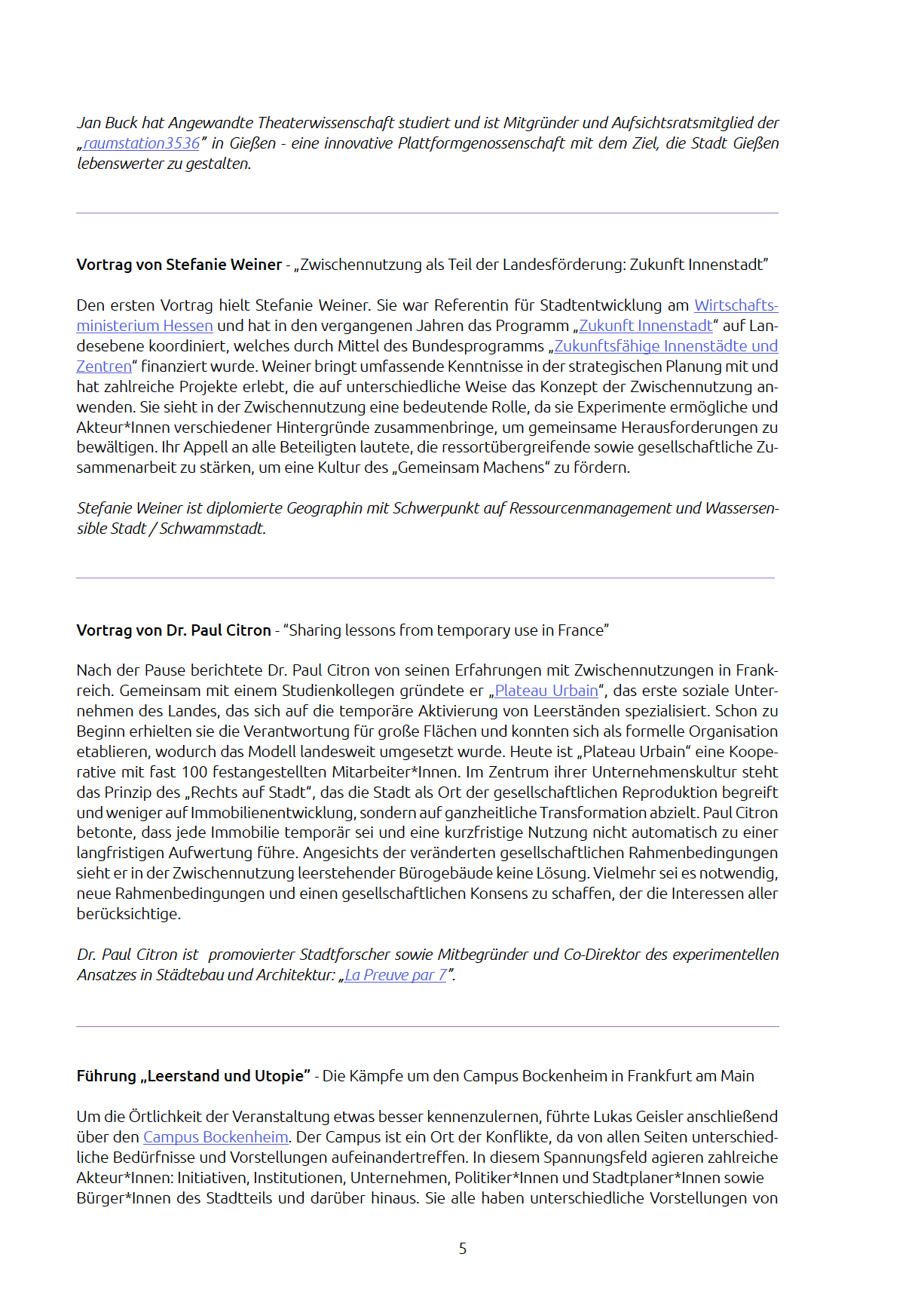 Am ersten Tag der Konferenz wird die Rolle von Zwischennutzungen im Kontext der Stadtentwicklung beleuchtet, und es werden die damit verbundenen Widersprüche und Kontroversen thematisiert. Expert*innen aus verschiedenen Disziplinen und administrativen Ebenen werden ihre Perspektiven vorstellen.