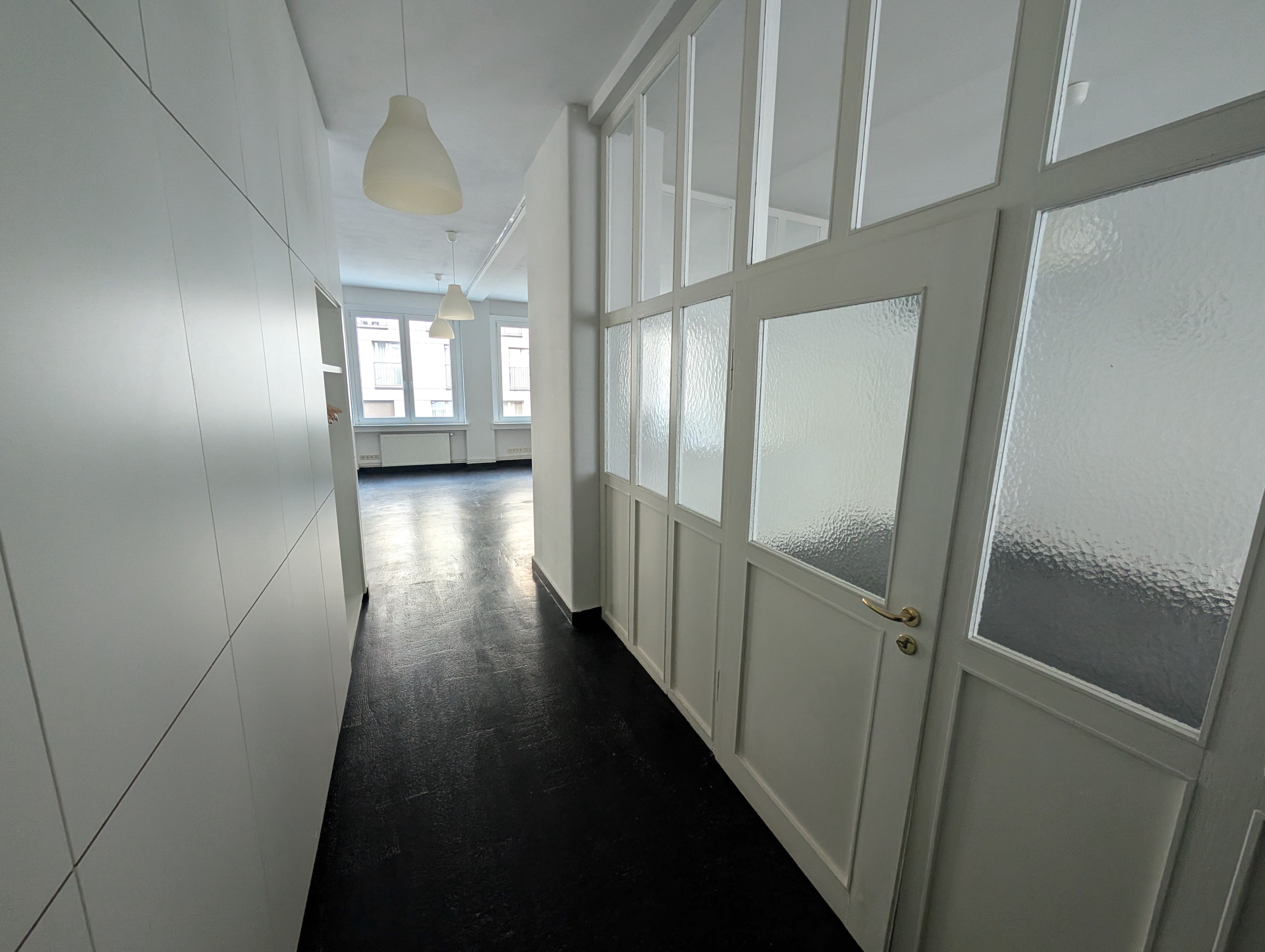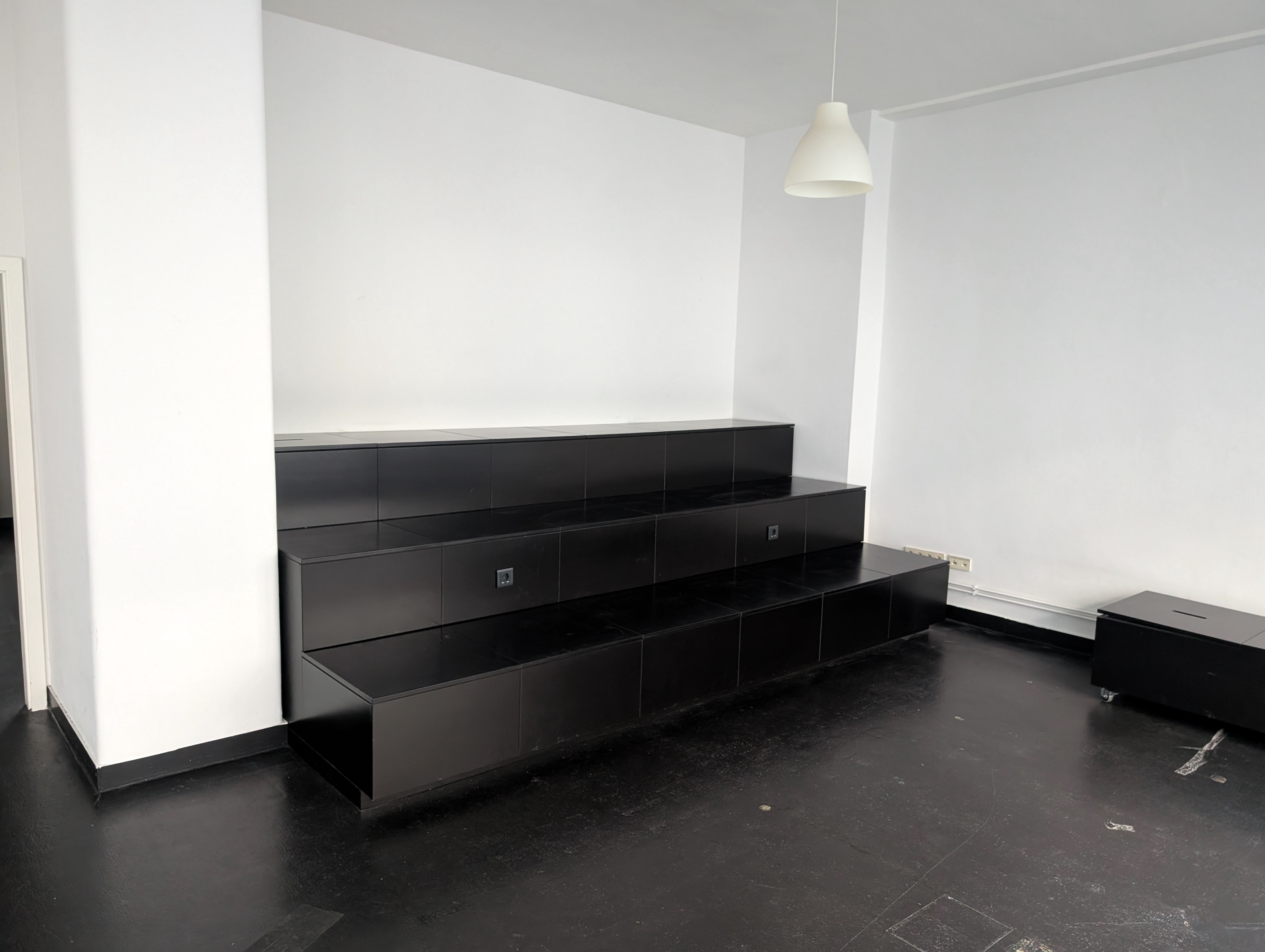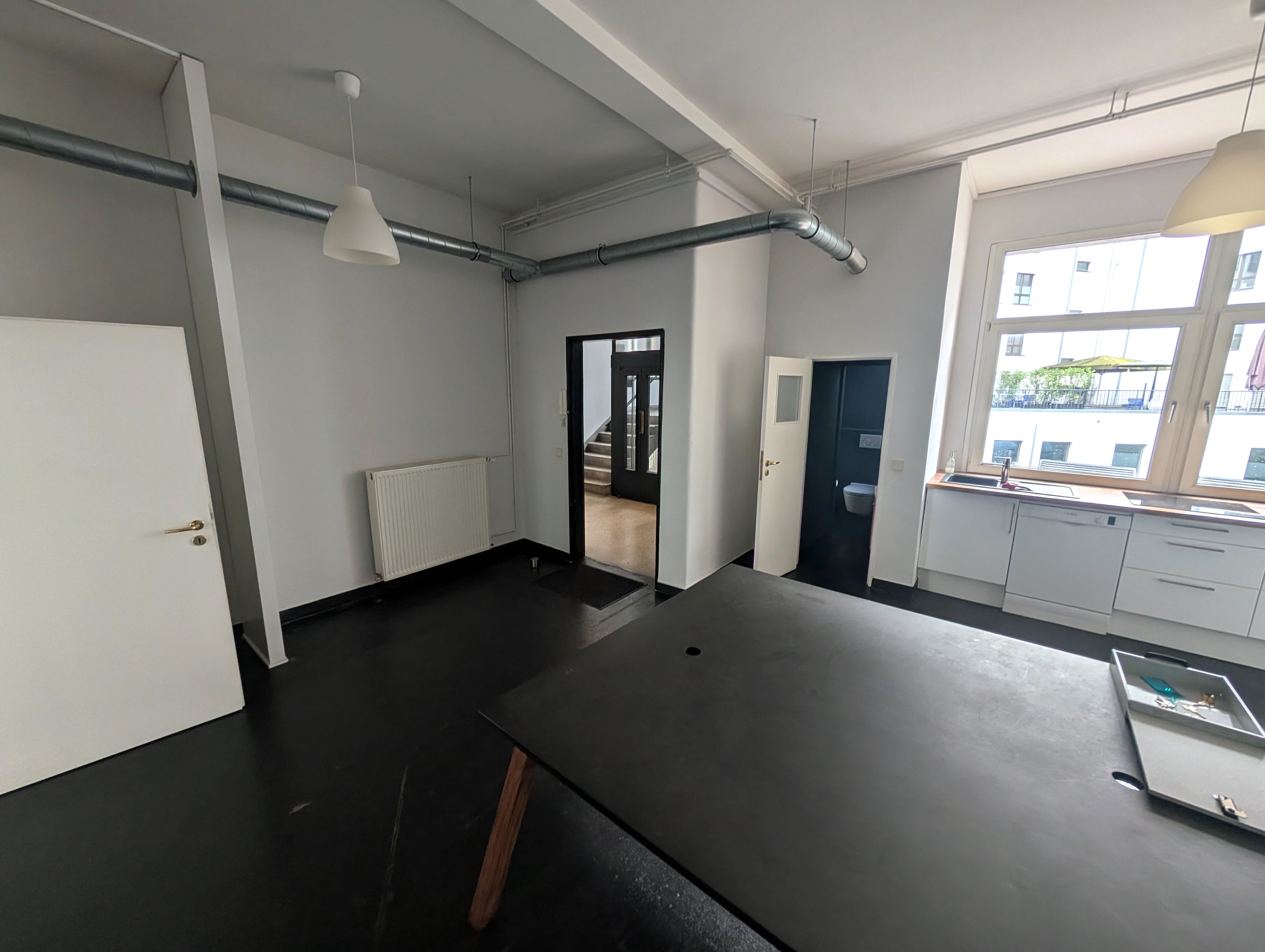Durch die Kombination historischer Elemente, dem schwarz gestrichenen Estrich, Schrank- und Treppeneinbauten, haben die Räume ihren eigenen Loftcharakter und eignen sich für vielfältige Büronutzungen, u. a. im Bereich Agentur, Architektur oder Design.