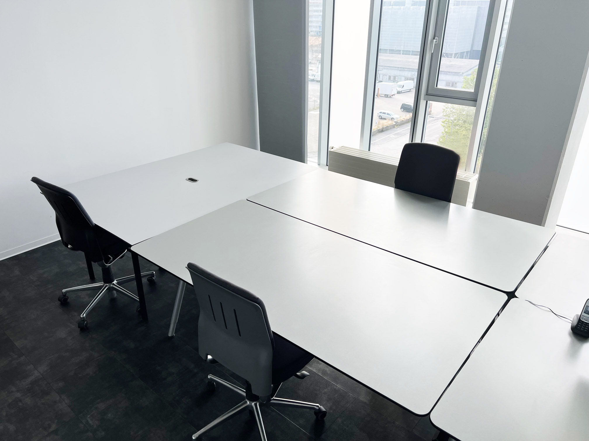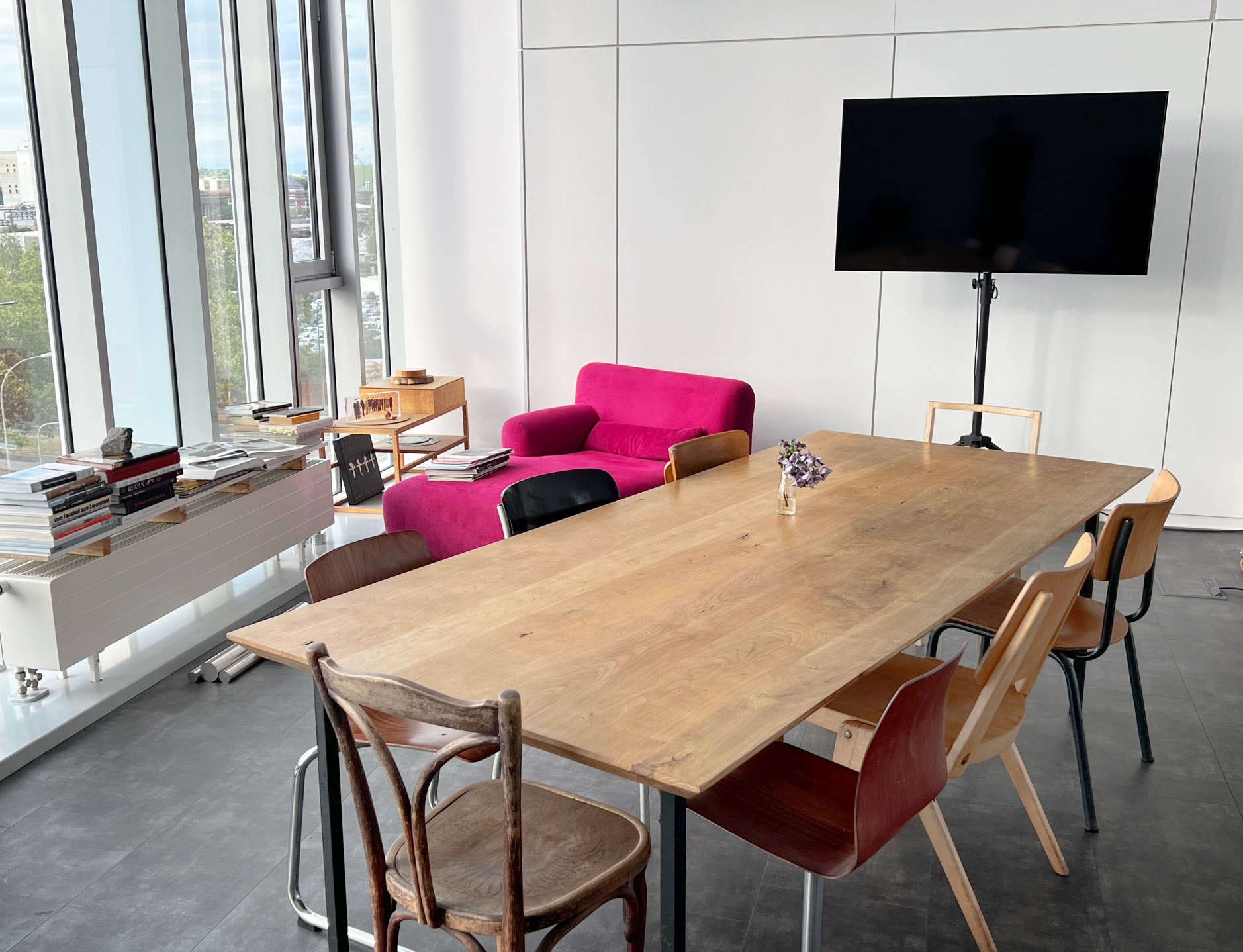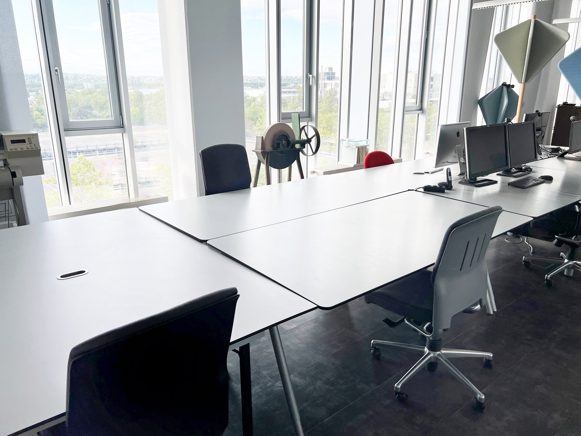 Wir bieten gut ausgestattete Arbeitsplätze vom Einzelplatz bis zu fünf Arbeitsplätzen. Coworking im großen Studioraum, möbliert mit Bene, Vitra, Edra, Vintage und Eigenbau. Raumhöhe 4 Meter, voll renoviert, klimatisiert mit Fenstern über die gesamte Wandfläche ausgestattet. Wir haben eine unverbaute Sicht Richtung Taunus. Das Büro verfügt über eine Küche, separate Sanitärbereiche, Reinigungsservice, Personenaufzüge, Lastenaufzug und kostenfreie Besucherparkplätze.