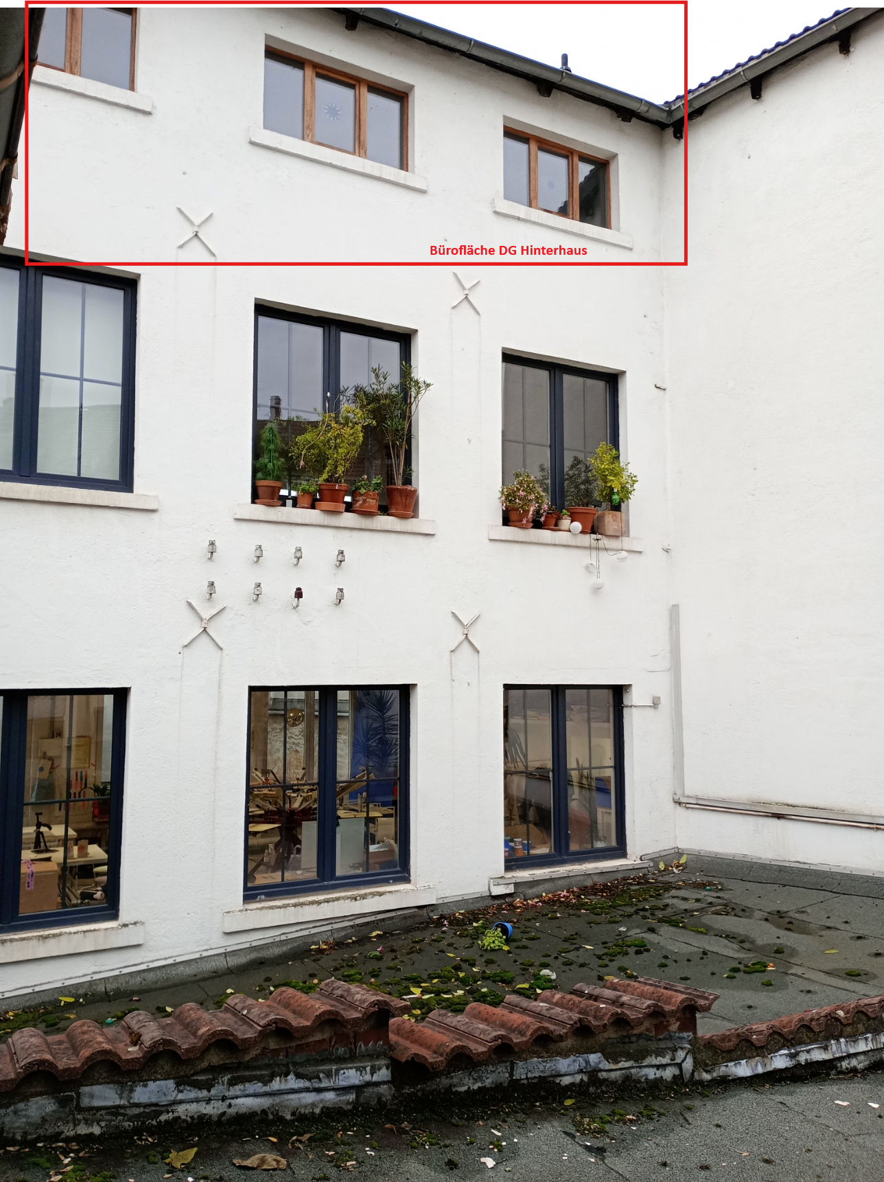 Die angebotenen Räume befinden sich im Dachgeschoss des Gebäudes und sind über eine alte Stahltreppe zu erreichen. Da diese recht schmal ist, sollte kein großer Publikumsverkehr herrschen. Die Räume selbst sind durch viele Fenster sehr hell und bieten einen weiten Ausblick über die Hinterhöfe von Bockenheim. Die ruhige Lage erlaubt ein entspanntes Arbeiten ohne Ablenkung.