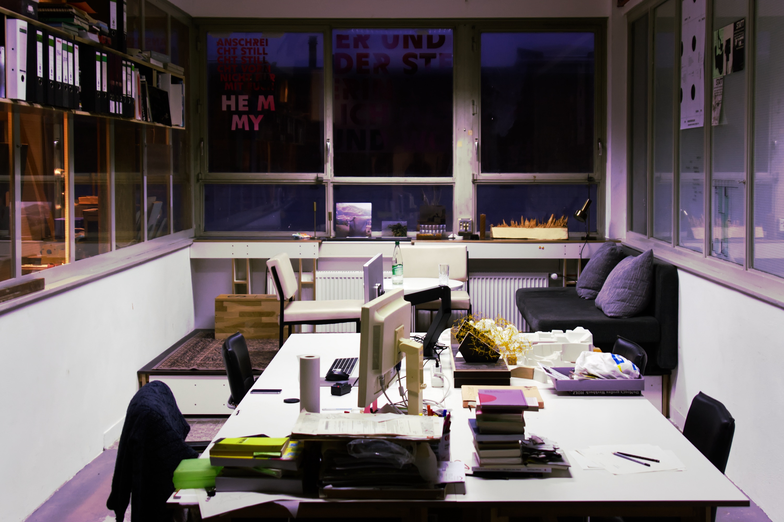 Schreibtischnachbar:innen sind Künstler:innen aus dem Bereich Bildhauerei & Performance. An das Büro schliesst eine Werkstatt an - Küche, sowie Lagerflächen, können mitbenutzt werden. Der Büroraum in der Halle 404 ist Teil von fritzdeutschlanD e.V., ein Verein aus Künstler:innen und Handwerker:innen aus den Bereichen: Holz- & Steinbearbeitung, Musik, Kulissenbau, Elektrik, Film, etc.