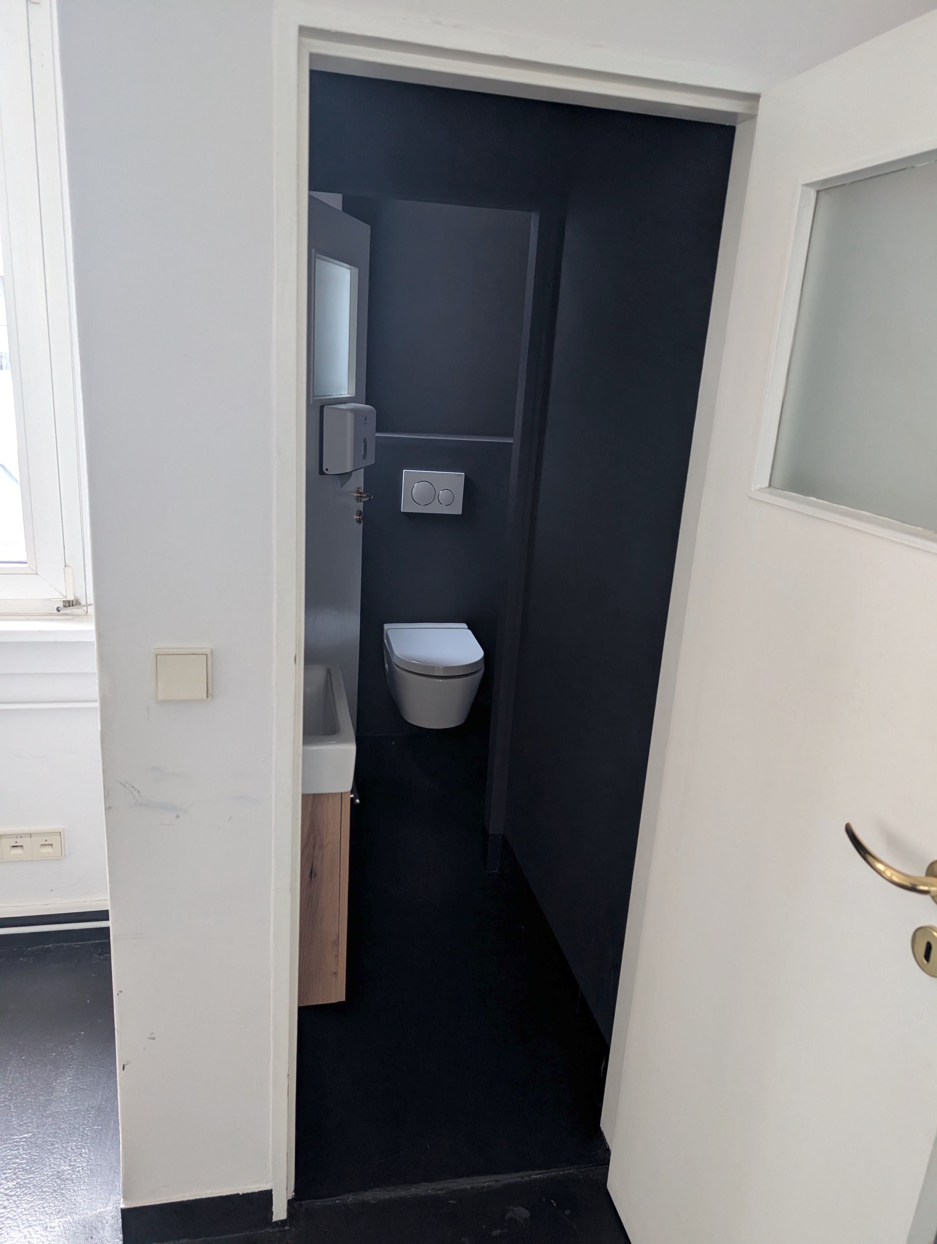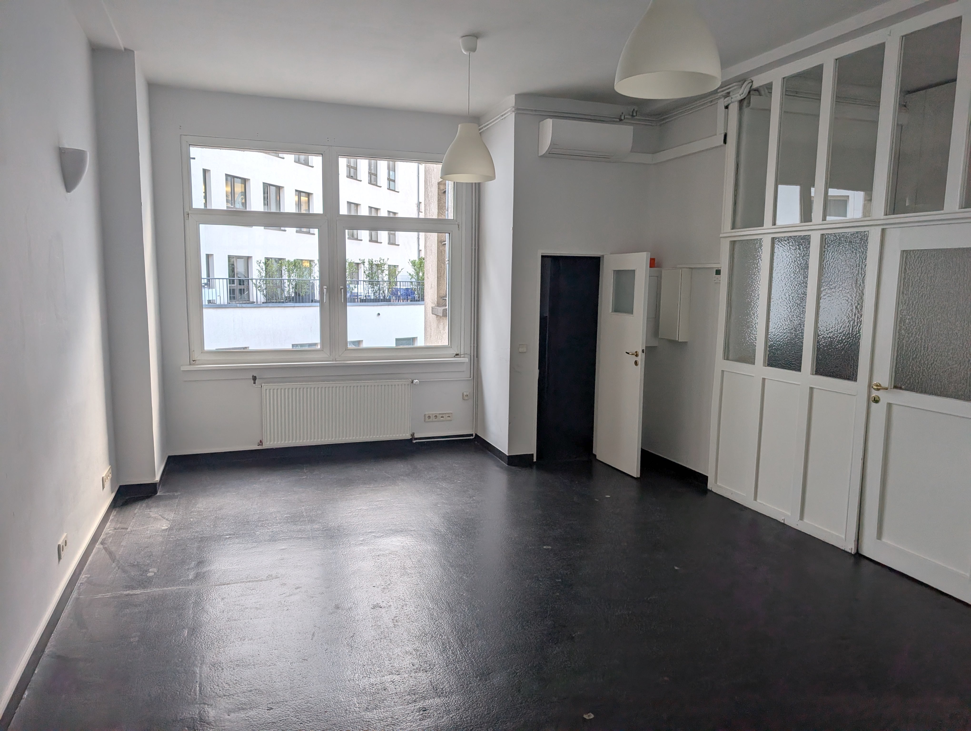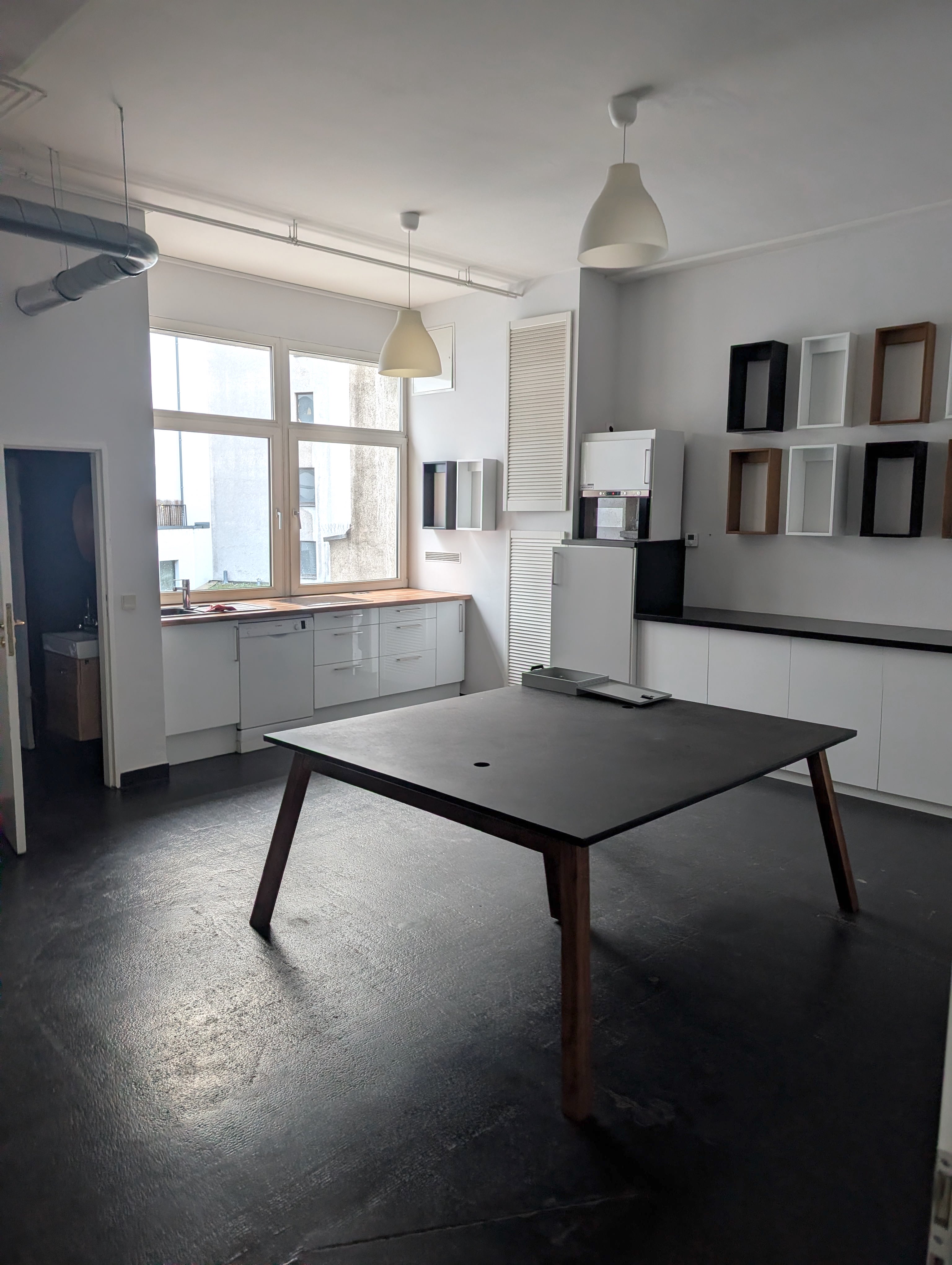 Durch die Kombination historischer Elemente, dem schwarz gestrichenen Estrich, Schrank- und Treppeneinbauten, haben die Räume ihren eigenen Loftcharakter und eignen sich für vielfältige Büronutzungen, u. a. im Bereich Agentur, Architektur oder Design.